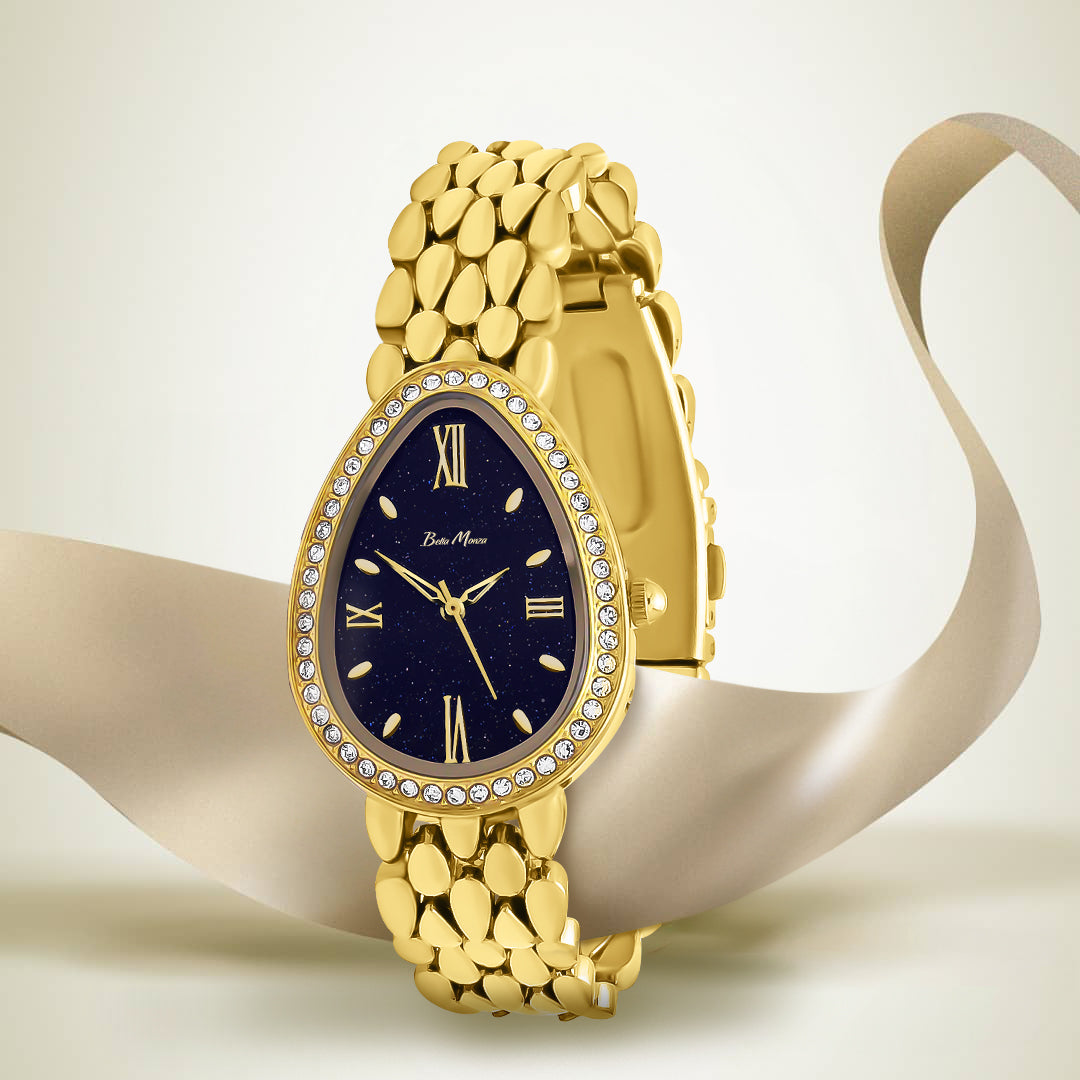 In the depths of the night, where the sky unveils its secrets, the Aquadrop Allure Midnight Enigma collection emerges, a journey through the mysteries of the cosmos, guided by the eternal shimmer of stars. Its gilded gold strap that mirrors the glistening pathways of the night.
